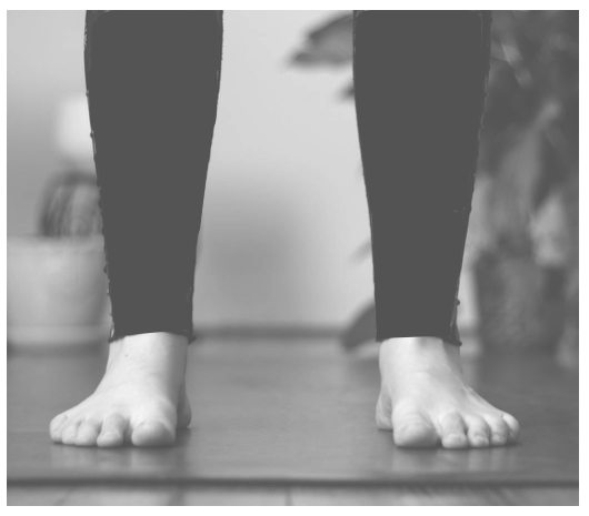 To begin, lift the heel of one foot and the toes of the other foot, off the floor.