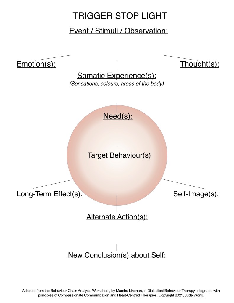 This is a tool that combines Non-Violent Communication and Somatic (Body) Experiences with the original ‘Behaviour Chain Analysis Worksheet’ from Dialectical Behaviour Therapy by Marsha Linehan, Ph.D., ABPP.